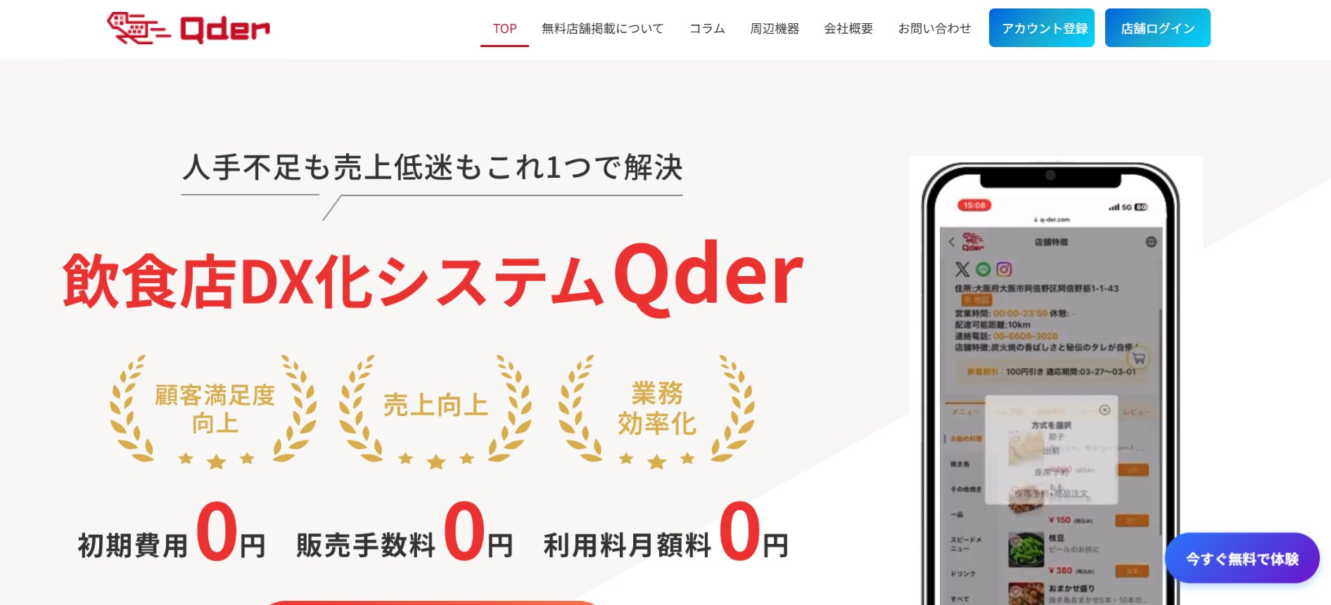 Qder は、飲食店向けにモバイルオーダー、席予約、売上、在庫管理、顧客分析まで提供するサービスです。公式サイトでは、モバイルオーダーを越えた業務革命AIシステムとして案内されており、注文、会計、集客、分析をまとめて支援する点が特徴です。