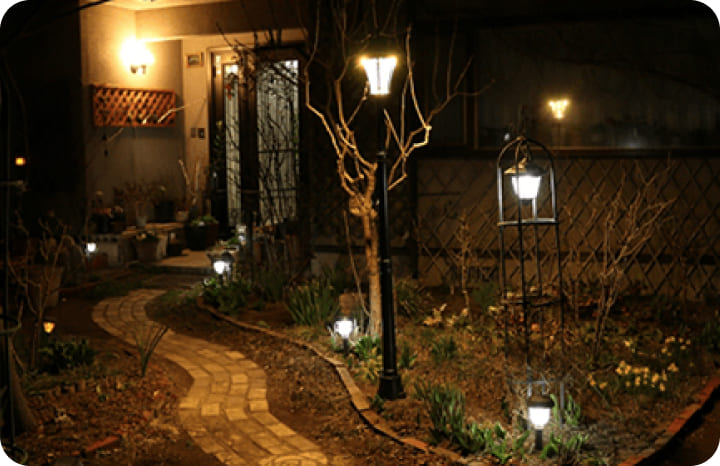 玄関のウェルカムライトや庭の照明、車庫の照明など、屋外の照明設置もお任せください。人感センサー付きライトや、防犯カメラなど、屋外でも防水機能付きの照明等を取り付けします。