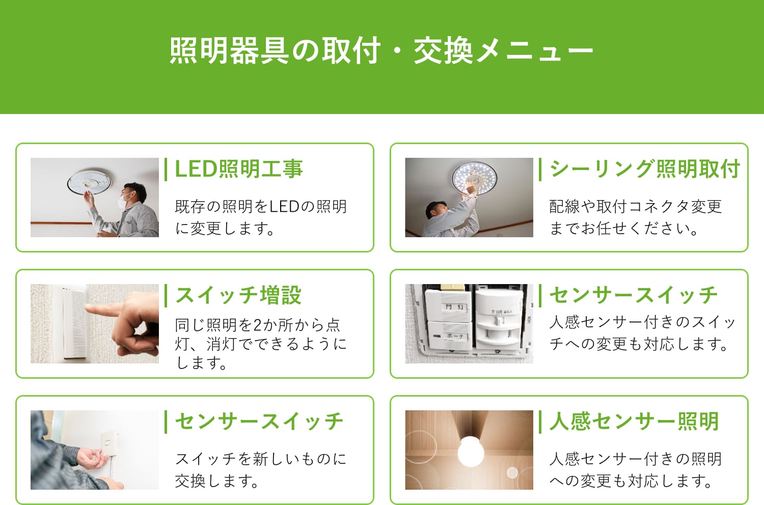 従来の蛍光灯、白熱灯から、LED照明へ変更されたい場合は、お気軽にご相談ください。お客様にて購入されたLED照明の取付も対応致します。